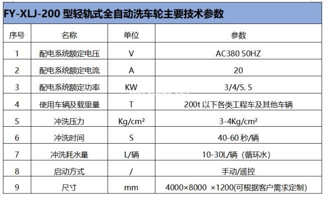 FY-XLJ-200輕軌式全自動洗輪機(jī)∶工程全自動洗輪機(jī),楓葉洗輪機(jī)采用紅外對射自動感應(yīng)式、遙控和手動三種控制,可自動完成沖洗工作,沖洗用水可循環(huán)使用連續(xù)工作時,僅需補(bǔ)充少量的水,因此可以節(jié)約大量水資源。